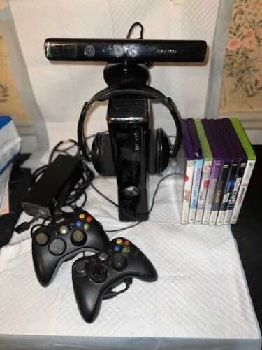Microsoft Xbox 360 S 250GB Model 1439 With 2 Controllers, Kinect, Cords, 8 Games